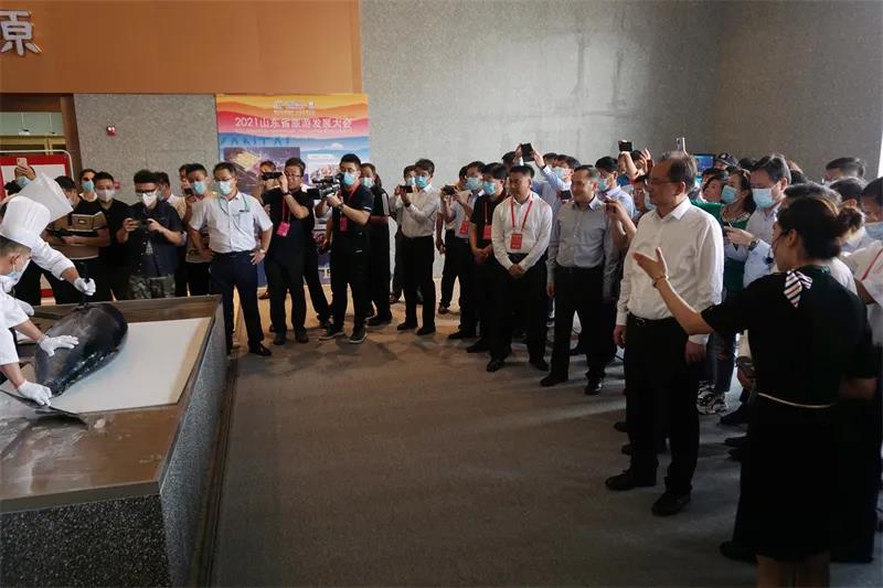 “咣!上鱼喽!”伴随一声嘹亮的吆喝,六人抬着一条200斤重的的金枪鱼,送到展示厅厨师面前现场开鱼,作为隆重又极具特色的海洋民俗文化,硕大的金枪鱼在主刀厨师手里,仅仅几分钟就被去头去尾,剔骨剥肉,现场观众不禁叫绝。9月23日下午,2021山东省旅游发展大会参会代表一行来到芝罘湾商旅综合体观摩考察,打卡烟台生态渔市文化新地标,体验商旅融合多元休闲新场景。