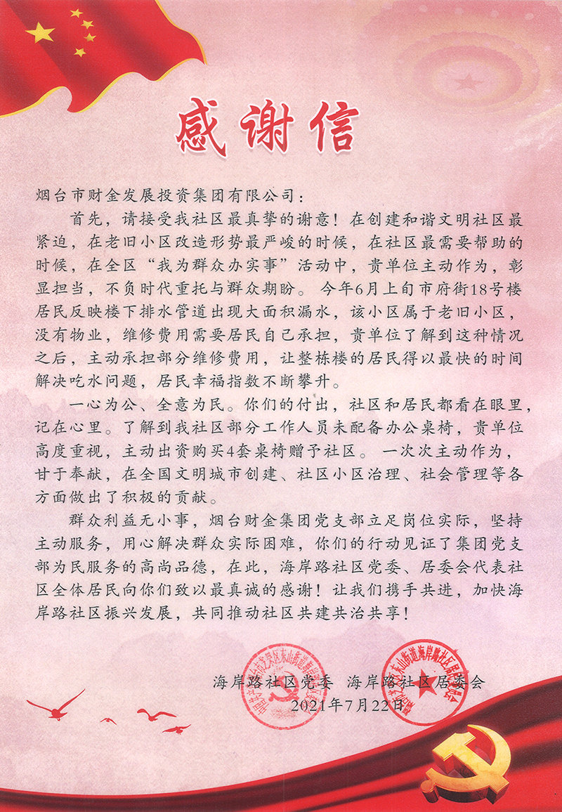近日,集团收到了一封“双报到”社区寄来的感谢信,东山街道海岸路社区党委、居委会代表社区全体居民向集团党支部在为民服务中主动担当、积极作为致以真诚感谢。