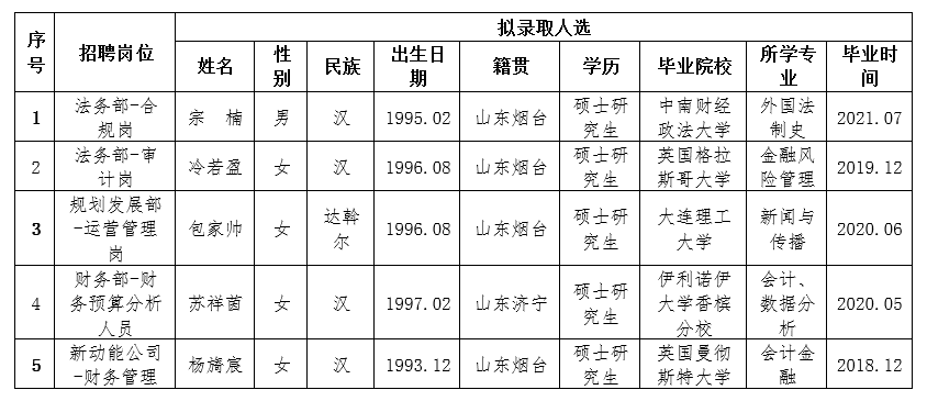 按照2020年8月28日发布的《2020年烟台财金集团面向“双一流”和全球TOP200高校毕业生公开招聘简章》相关规定,经过简历收集、资格审查、初试、复试、集体决策等环节,拟确定部分岗位录取人选(详见下表),现予以公示,公示期为5个工作日(9月29日至10月13日)。公示期间如有异议,请与烟台市财金发展投资集团有限公司联系,电话:0535-6887256。