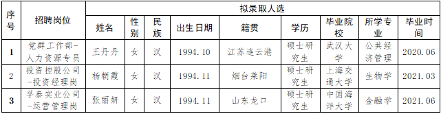 按照2020年8月28日发布的《2020年烟台财金集团面向“双一流”和全球TOP200高校毕业生公开招聘简章》相关规定,经过简历收集、资格审查、初试、复试、集体决策等环节,拟确定部分岗位录取人选(详见下表),现予以公示,公示期为5个工作日(11月10日至11月17日)。
